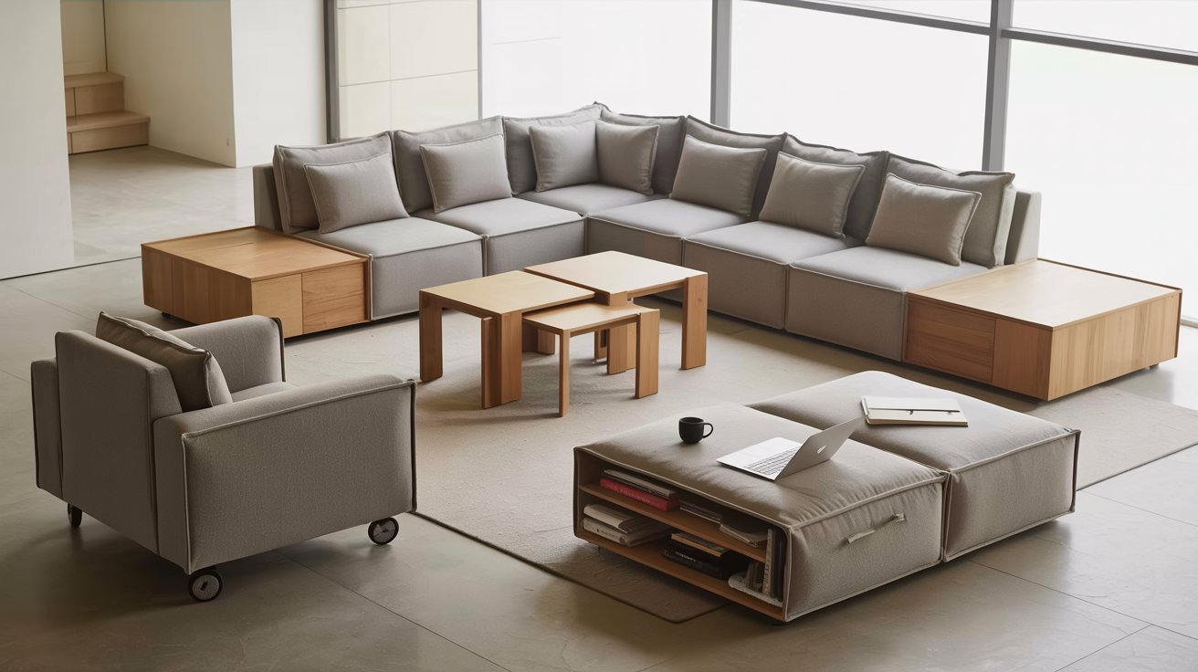This trend emphasizes modular sectionals, movable chairs, nesting tables, and multifunctional ottomans that can easily shift between work, relaxation, and entertainment setups. It aligns closely with the rise of remote and hybrid work, where living rooms must serve multiple purposes throughout the day.