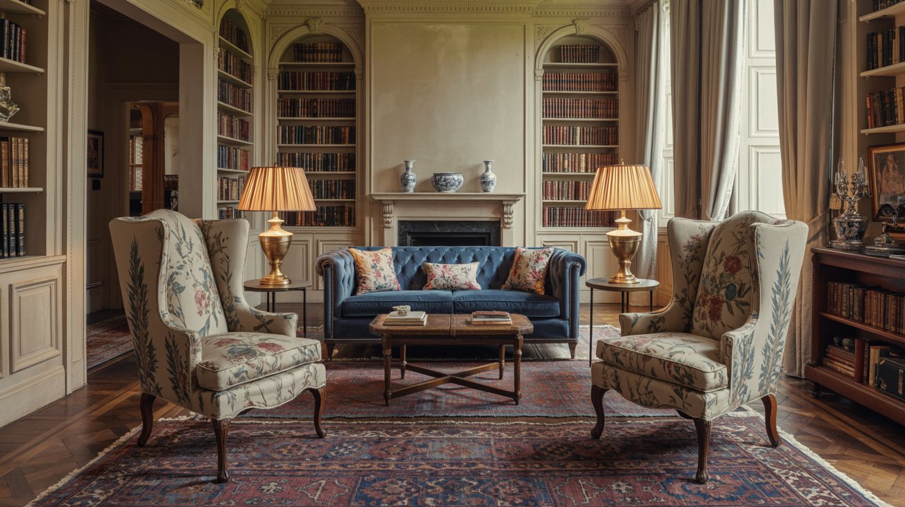 Antique and vintage furniture play a central role, valued for craftsmanship and authenticity. Floral upholstery, chinoiserie patterns, layered Persian-style rugs, and decorative trim create warmth and historical depth. Architectural details such as crown molding, paneled walls, and built-in bookcases are restored or added to reinforce character.